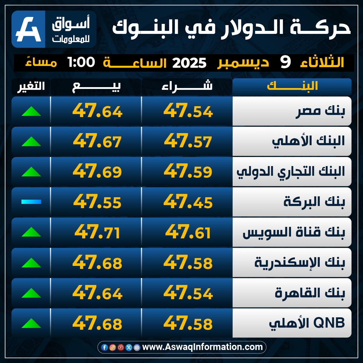 وصعد سعر الدولار في البنك الأهلي المصري مقابل الجنيه المصري عند 47.57 جنيه للشراء، ونحو 47.67 جنيه للبيع.