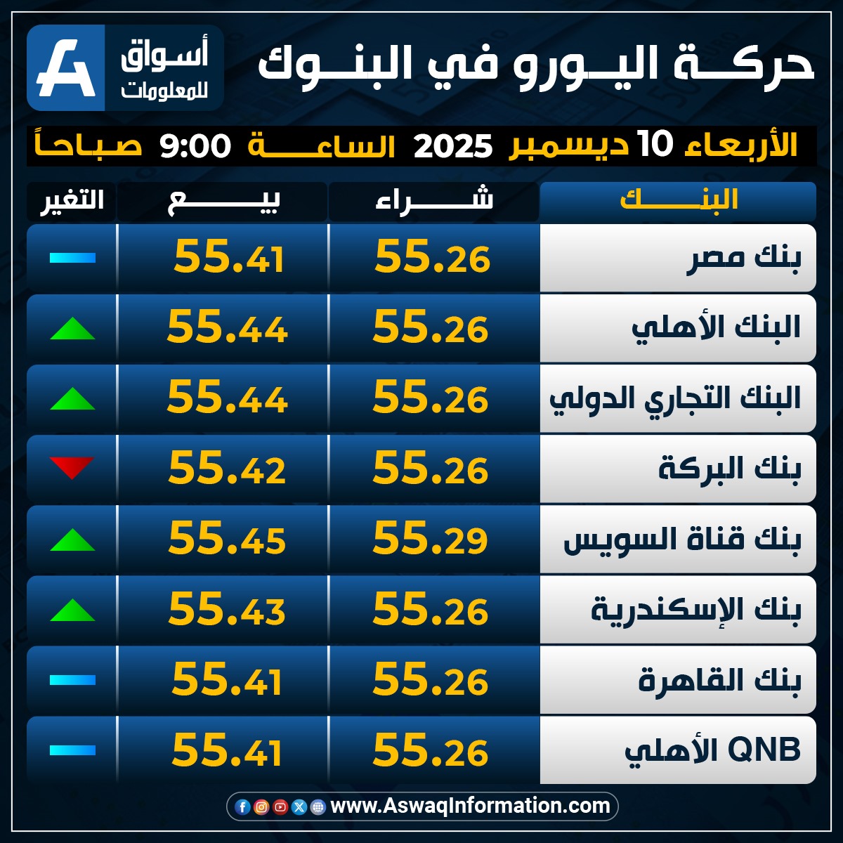 وزاد بنك الإسكندرية، سجل سعر اليورو نحو 55.26 جنيه للشراء، وسعر 55.43 جنيه للبيع