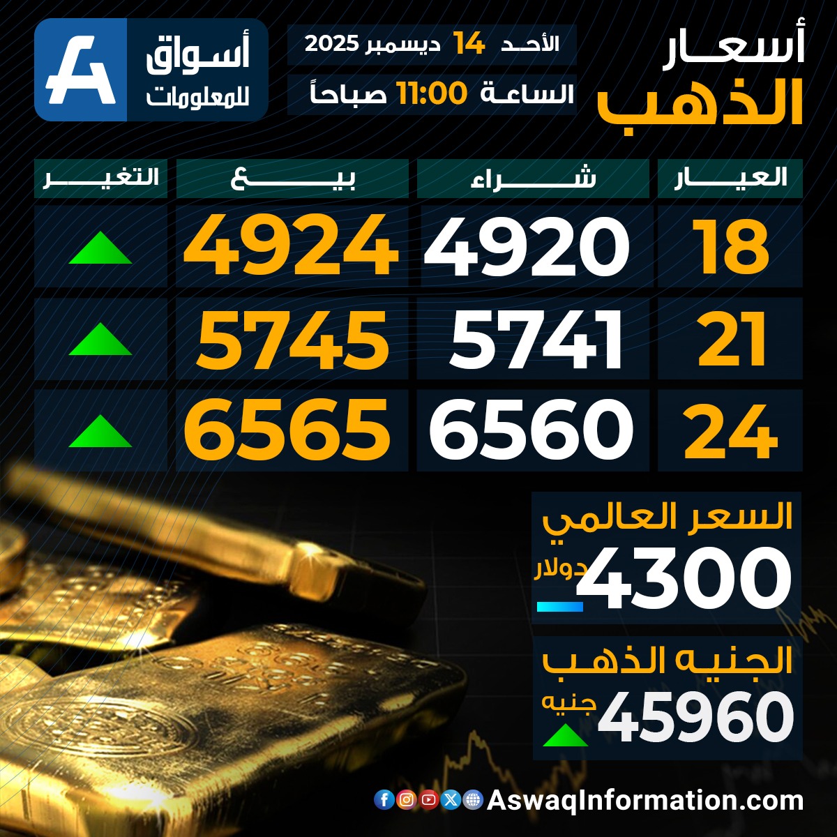سعر الذهب في مصر الأحد 14 ديسمبر 2025