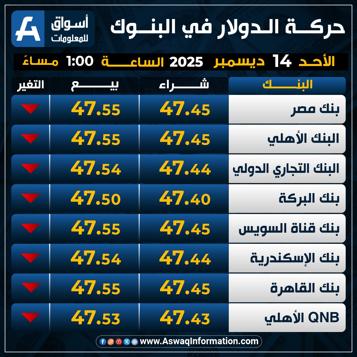 ونزل سعر الدولار في البنك الأهلي المصري مقابل الجنيه المصري عند 47.45 جنيه للشراء، ونحو 47.55 جنيه للبيع.