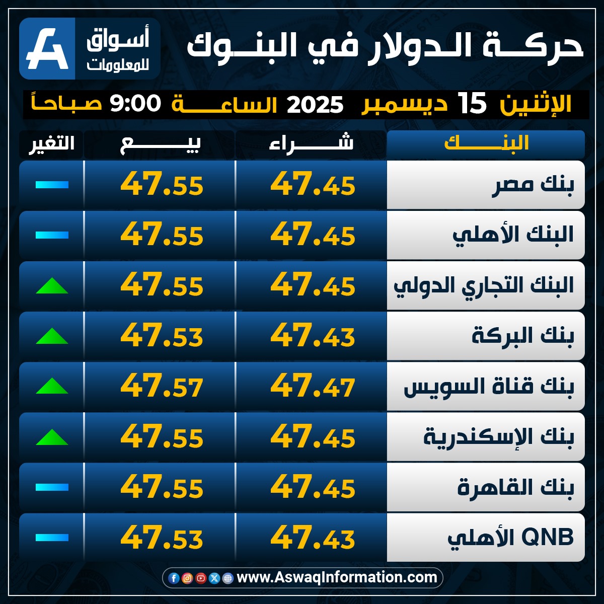 بينما ارتفع سعر الدولار في البنك التجاري الدولي مقابل الجنيه المصري عند 47.45 جنيه للشراء، ونحو 47.55 جنيه للبيع.