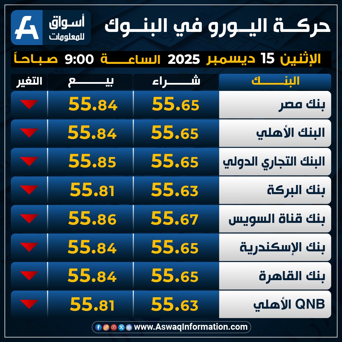 ونزل سعر اليورو في البنك التجاري الدولي نحو 55.65 جنيه للشراء، وسعر 55.84 جنيه للبيع