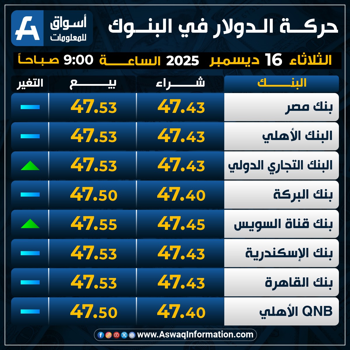 في حين استقر سعر الدولار في بنك الإسكندرية مقابل الجنيه المصري عند 47.43 جنيه للشراء، ونحو 47.53 جنيه للبيع.