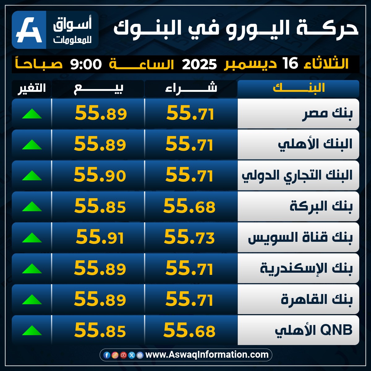 وصعد سعر اليورو في البنك الأهلي المصري نحو 55.71 جنيه للشراء، وسعر 55.89 جنيه للبيع