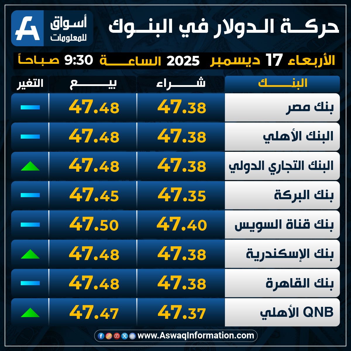 وثبت سعر الدولار في البنك الأهلي المصري مقابل الجنيه المصري عند 47.38 جنيه للشراء، ونحو 47.48 جنيه للبيع.