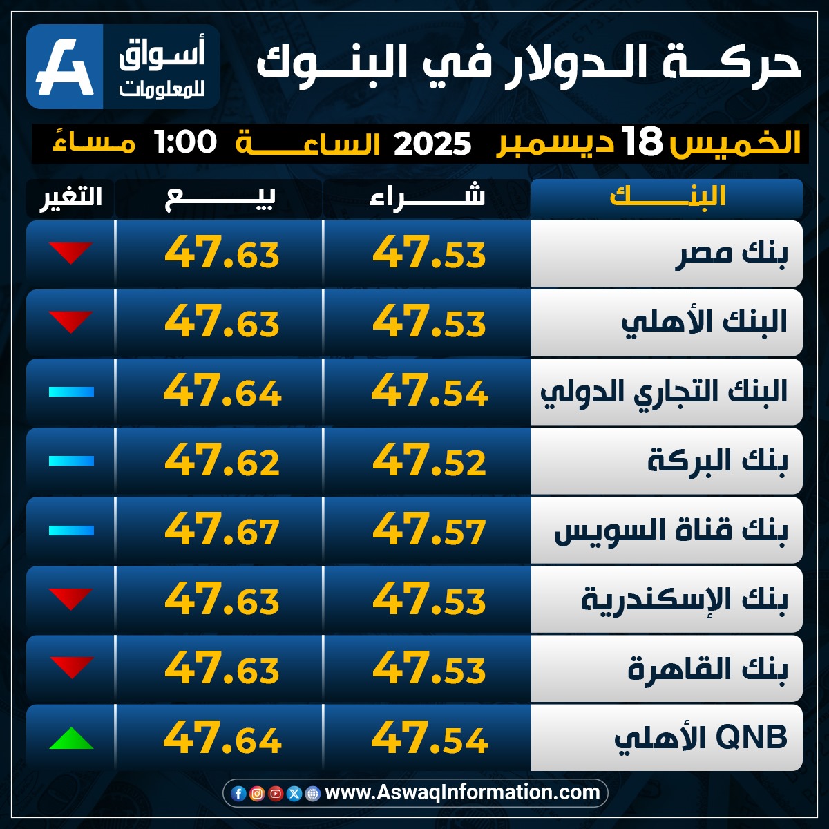 وهبط سعر الدولار في البنك الأهلي المصري مقابل الجنيه المصري عند 47.53 جنيه للشراء، ونحو 47.63 جنيه للبيع.