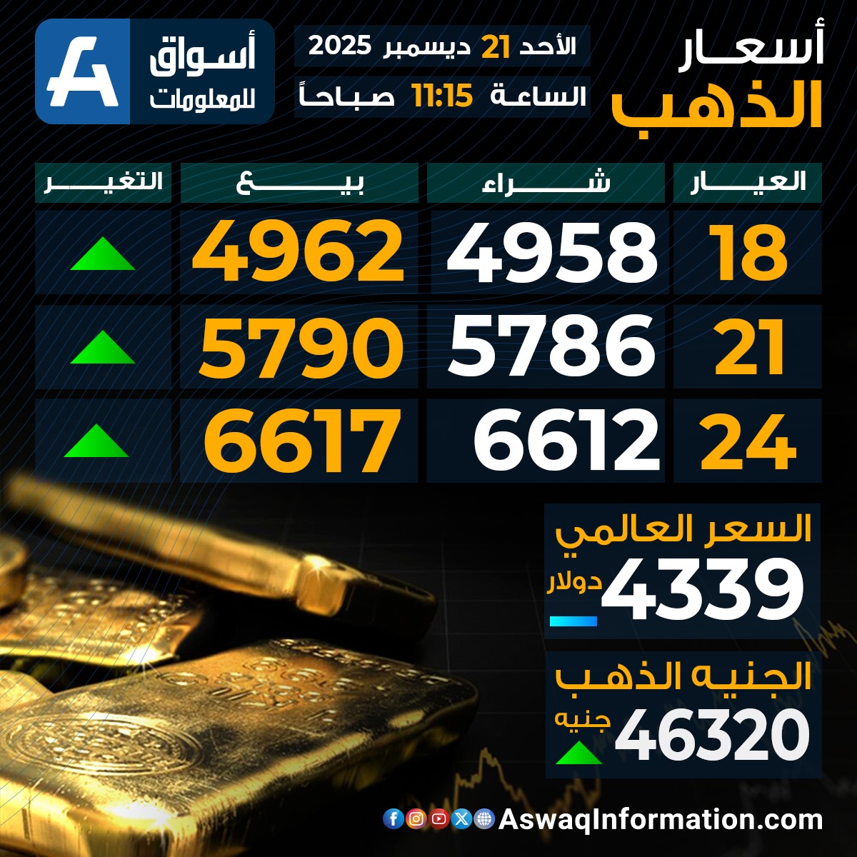 سعر الذهب في مصر الأحد 21 ديسمبر 2025