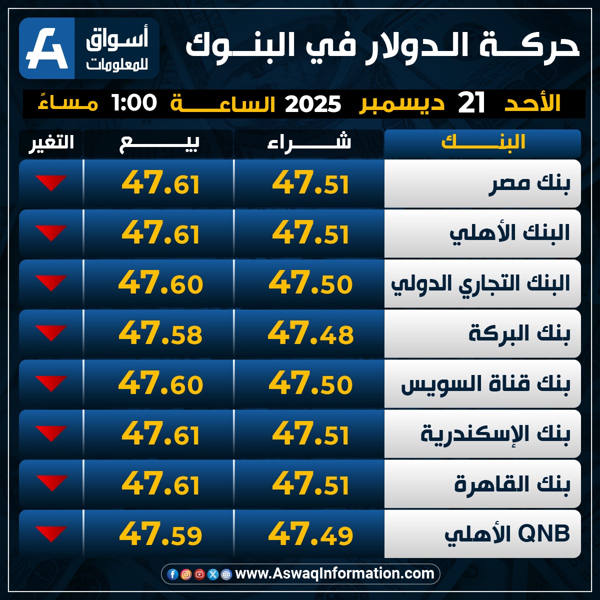 وهبط سعر الدولار في البنك الأهلي المصري مقابل الجنيه المصري عند 47.51 جنيه للشراء، ونحو 47.61 جنيه للبيع.