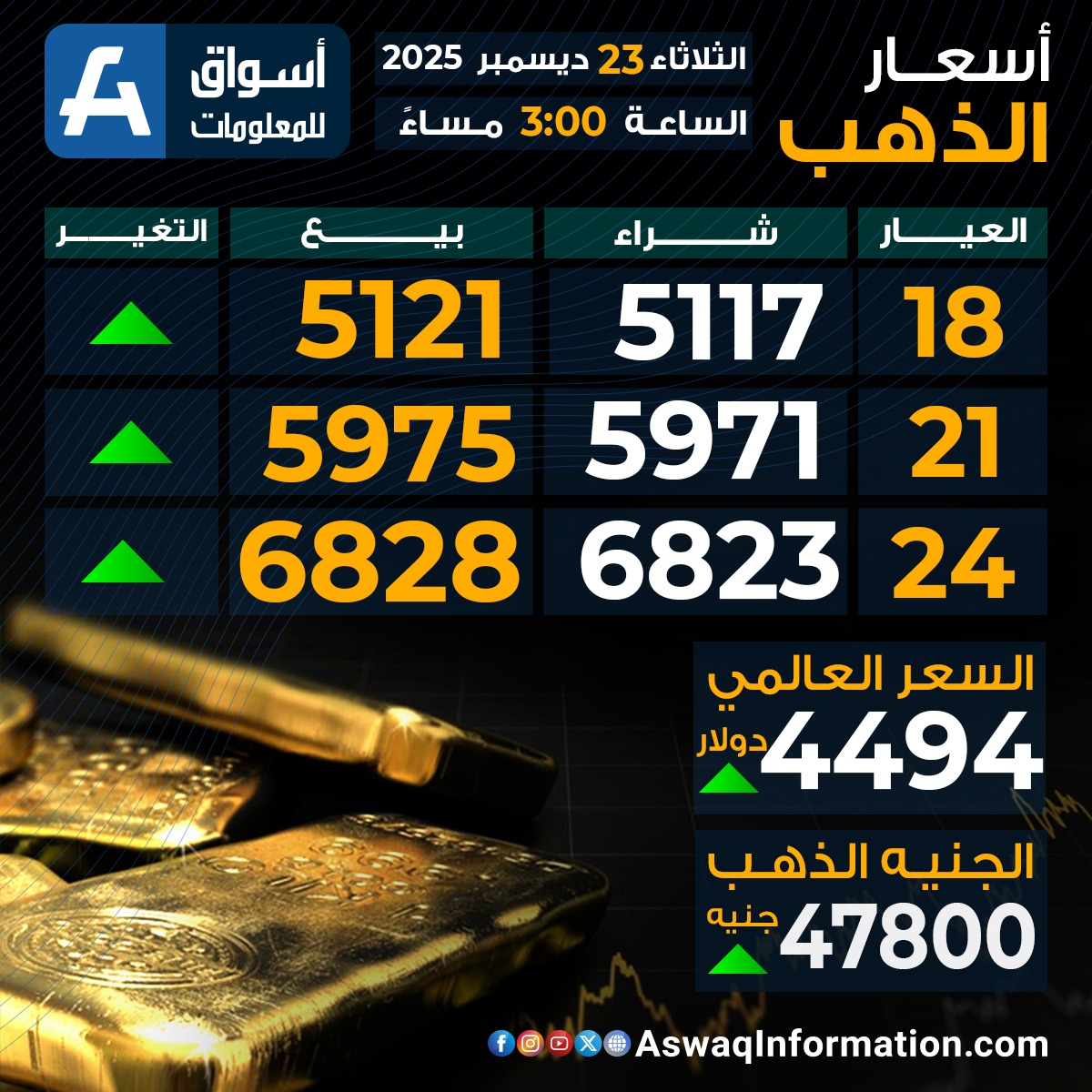 كما سجل سعر الذهب العالمي اليوم ارتفاعًا عند 4494 دولارا.