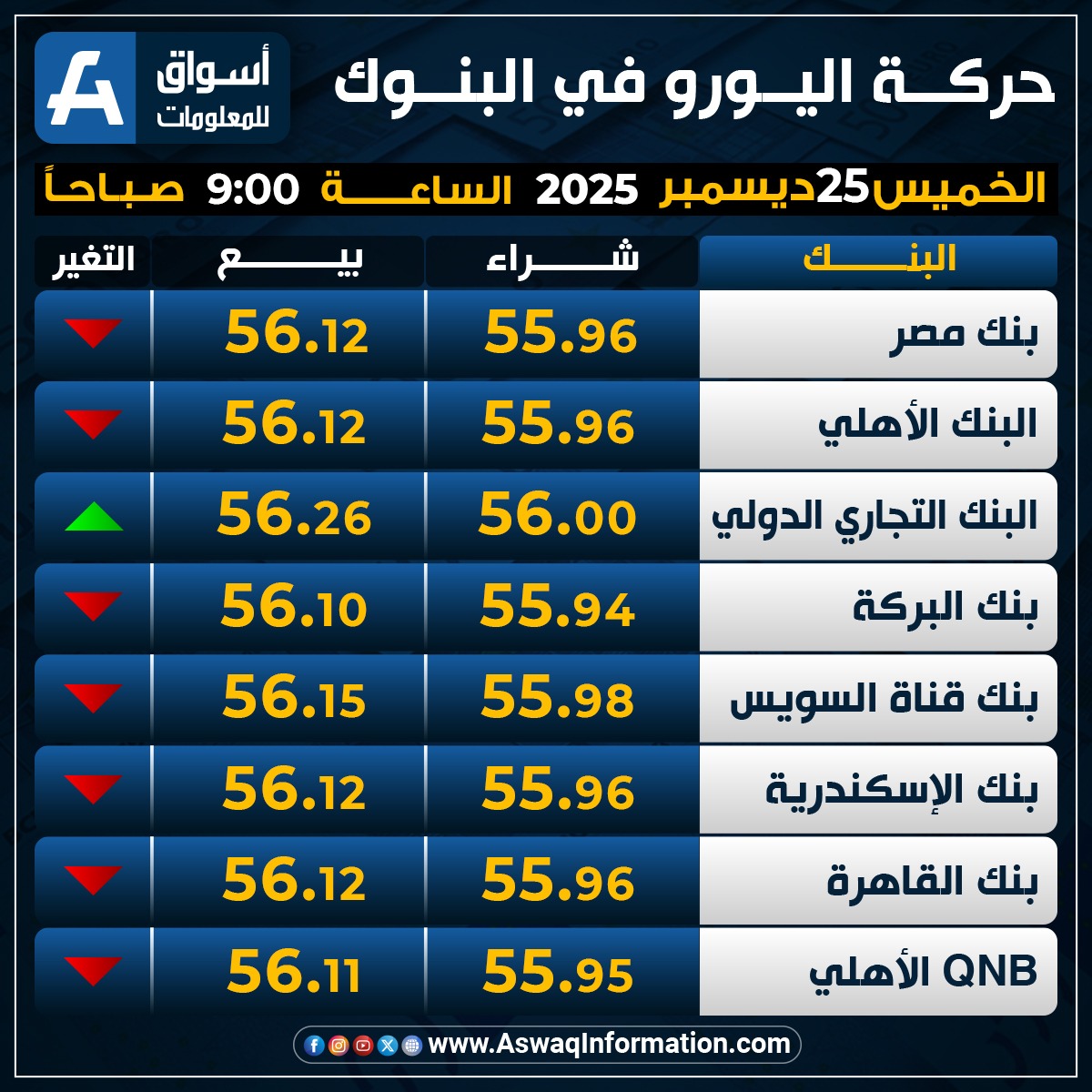 وهبط سعر اليورو في البنك الأهلي المصري نحو 55.96 جنيه للشراء، وسعر 56.12 جنيه للبيع