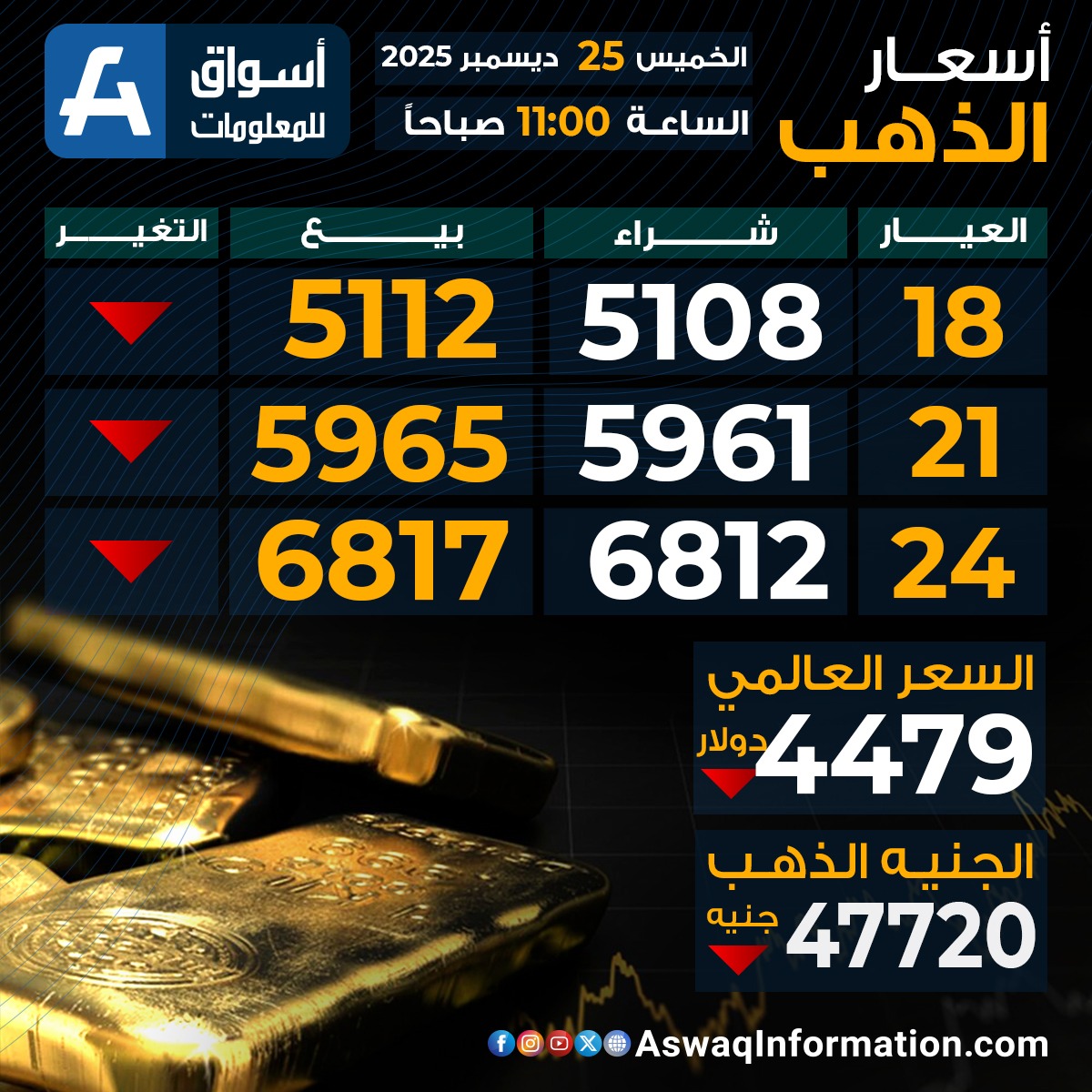 كما سجل سعر الذهب العالمي اليوم تراجعًا عند 4479 دولارا.