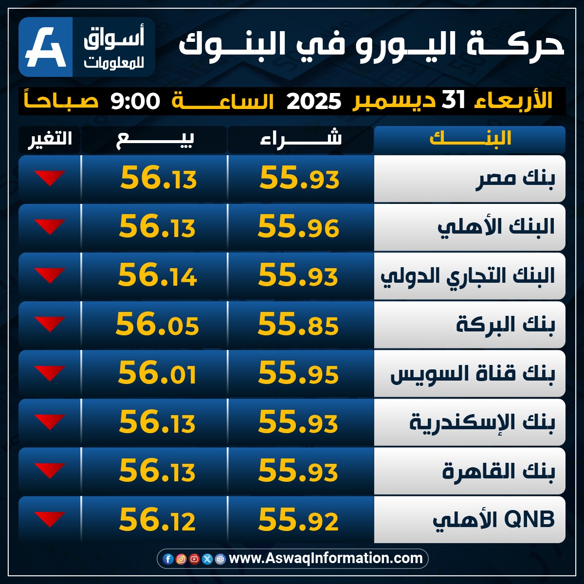 ونزل سعر اليورو في البنك الأهلي المصري نحو 55.96 جنيه للشراء، وسعر 56.13 جنيه للبيع