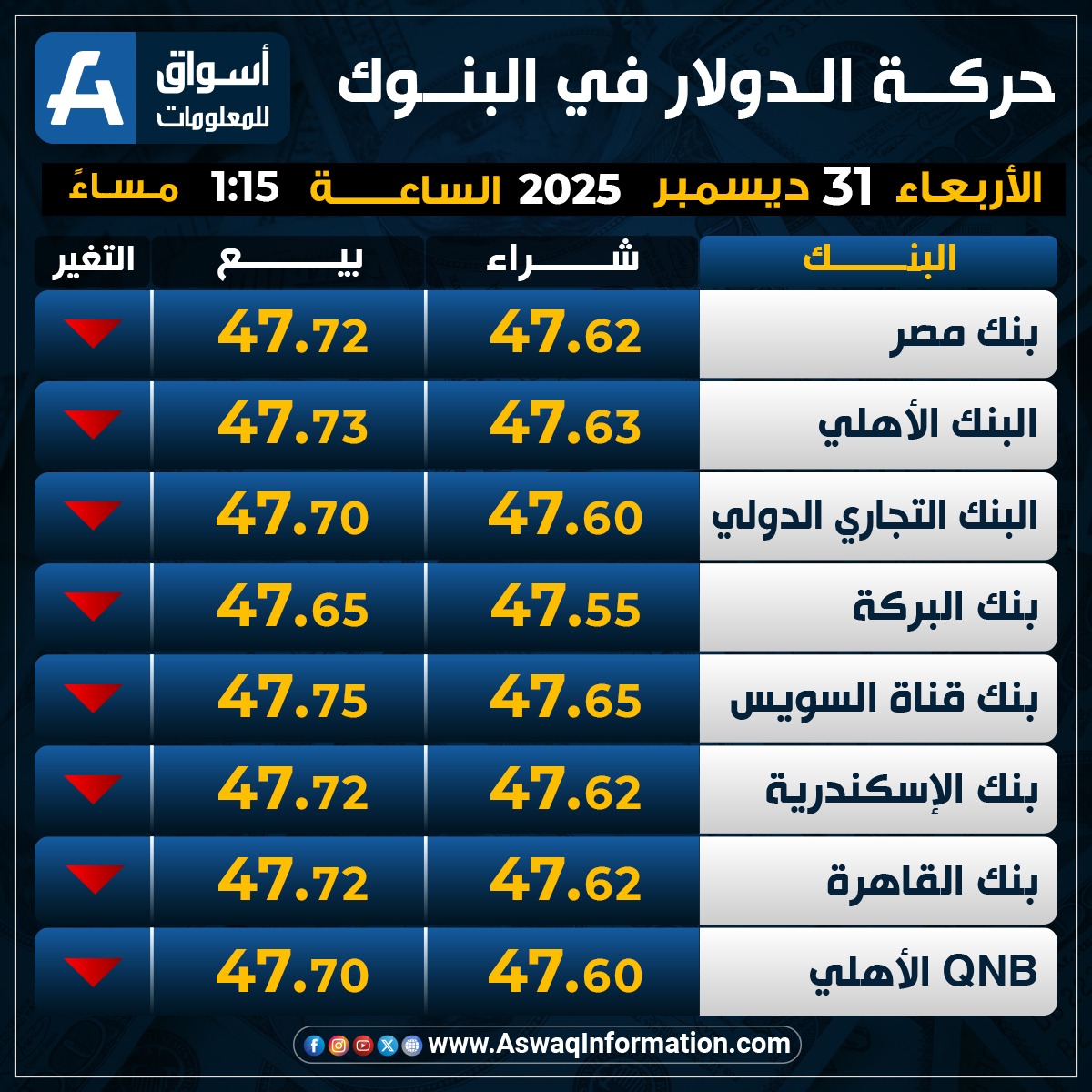 وانخفض سعر الدولار في بنك QNB الأهلي مقابل الجنيه المصري عند 47.60 جنيه للشراء، ونحو 47.70 جنيه للبيع.