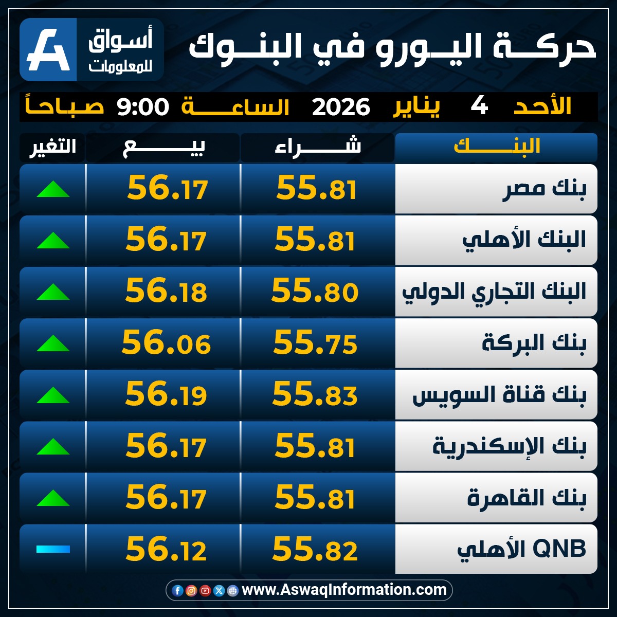 وقفز سعر اليورو في البنك التجاري الدولي نحو 55.80 جنيه للشراء، وسعر 56.18 جنيه للبيع