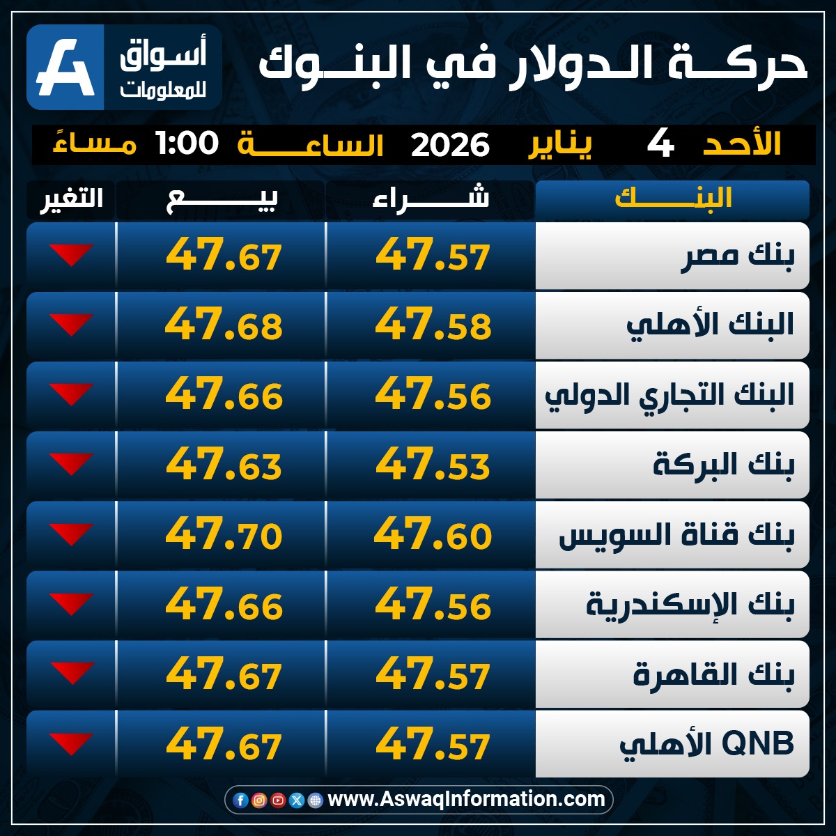 وانخفض سعر الدولار في بنك QNB الأهلي مقابل الجنيه المصري عند 47.57 جنيه للشراء، ونحو 47.67 جنيه للبيع.