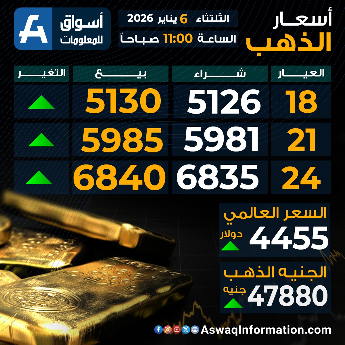 سجل سعر الجنيه الذهب اليوم الثلاثاء 6 يناير 2026 ارتفاعًا عند 47.880 جنيهًا ، قبل إضافة المصنعية والضريبة والدمغة.