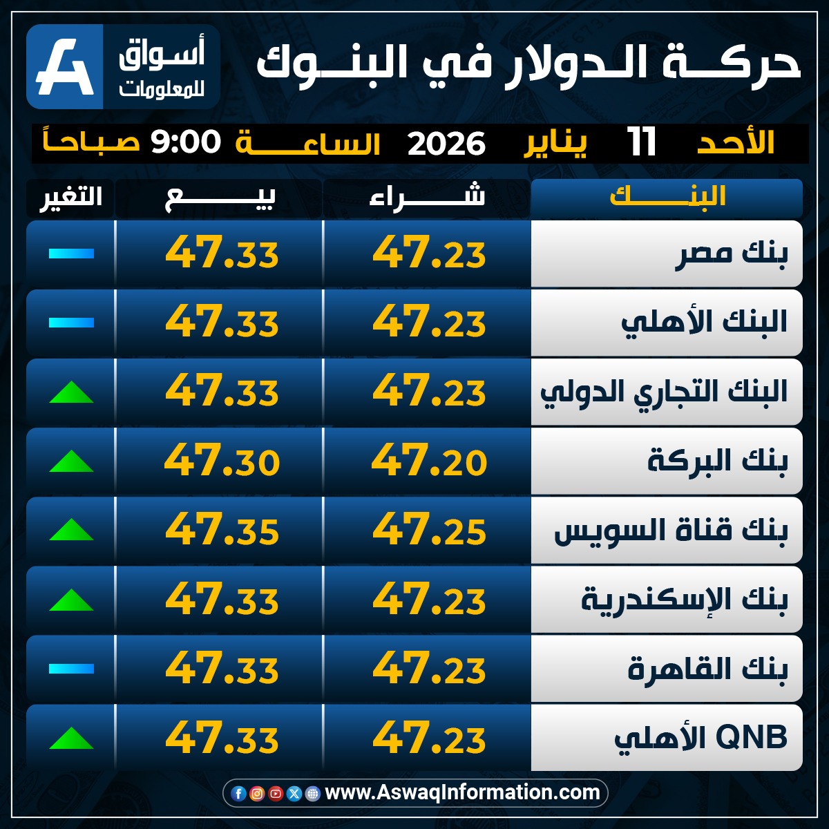 استقر سعر الدولار في بنك مصر مقابل الجنيه المصري عند 47.23 جنيه للشراء، ونحو 47.33 جنيه للبيع.
