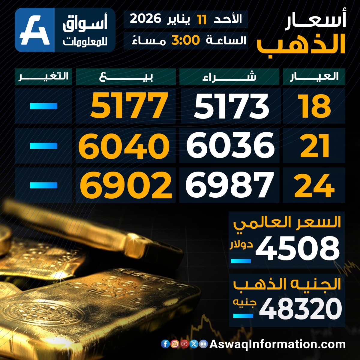 سجل سعر الجنيه الذهب اليوم الأحد 11يناير 2026 استقرارًا عند 48.320 جنيهًا ، قبل إضافة المصنعية والضريبة والدمغة.