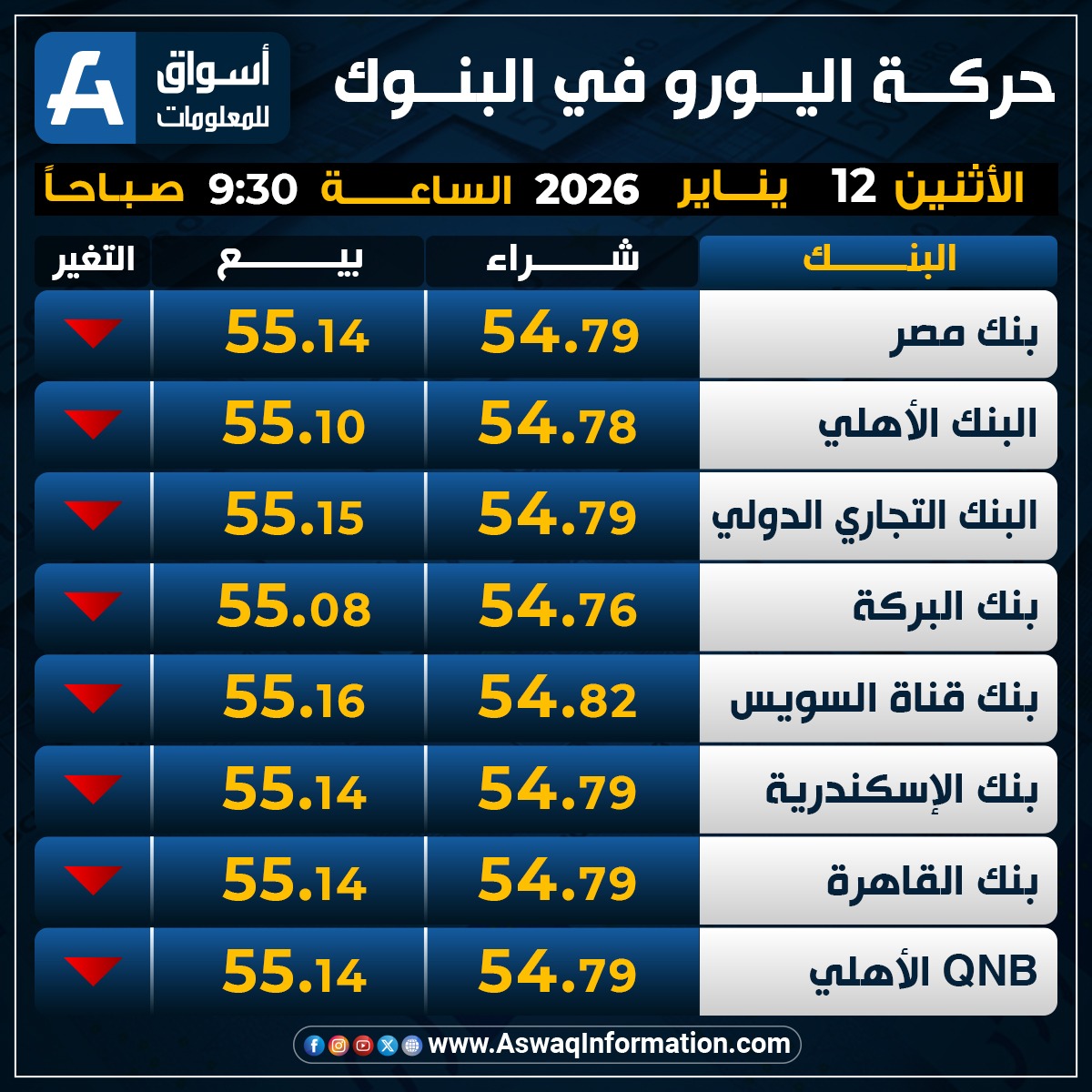وهبط سعر اليورو في البنك الأهلي المصري نحو 54.78 جنيه للشراء، وسعر 55.10 جنيه للبيع