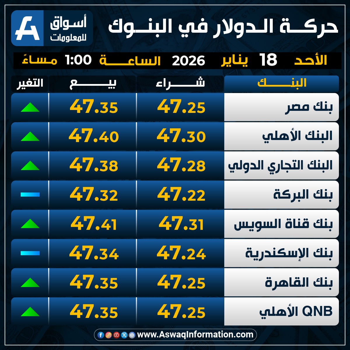 وصعد سعر الدولار في البنك الأهلي المصري مقابل الجنيه المصري عند 47.30 جنيه للشراء، ونحو 47.40 جنيه للبيع.