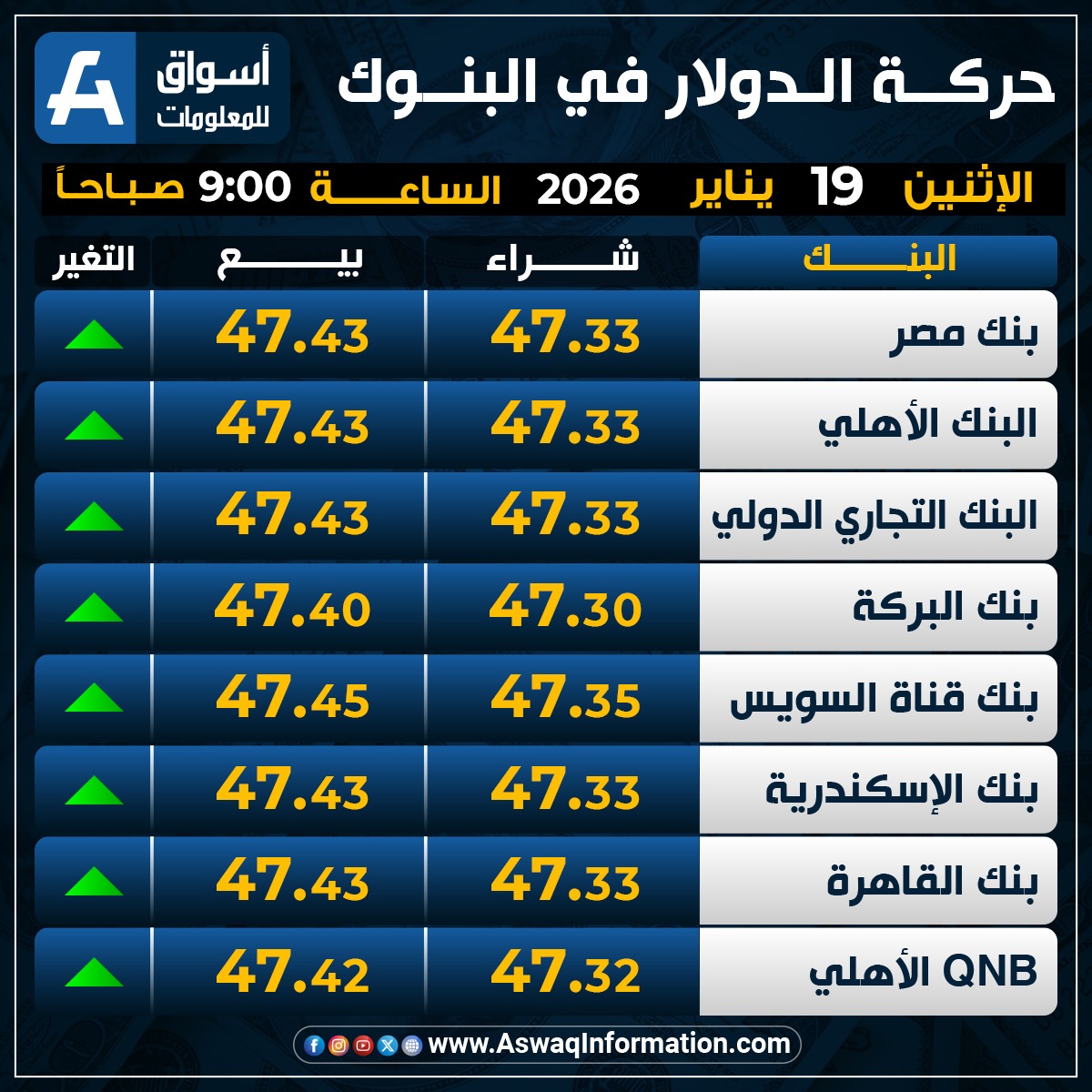 ارتفع سعر الدولار في بنك مصر مقابل الجنيه المصري عند 47.33 جنيه للشراء، ونحو 47.43 جنيه للبيع.