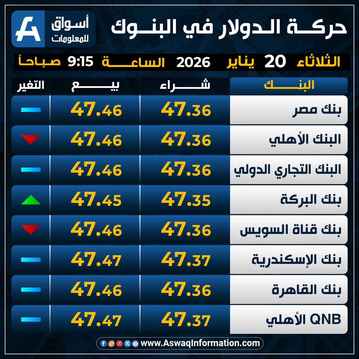 استقر سعر الدولار في بنك مصر مقابل الجنيه المصري عند 47.36 جنيه للشراء، ونحو 47.46 جنيه للبيع.