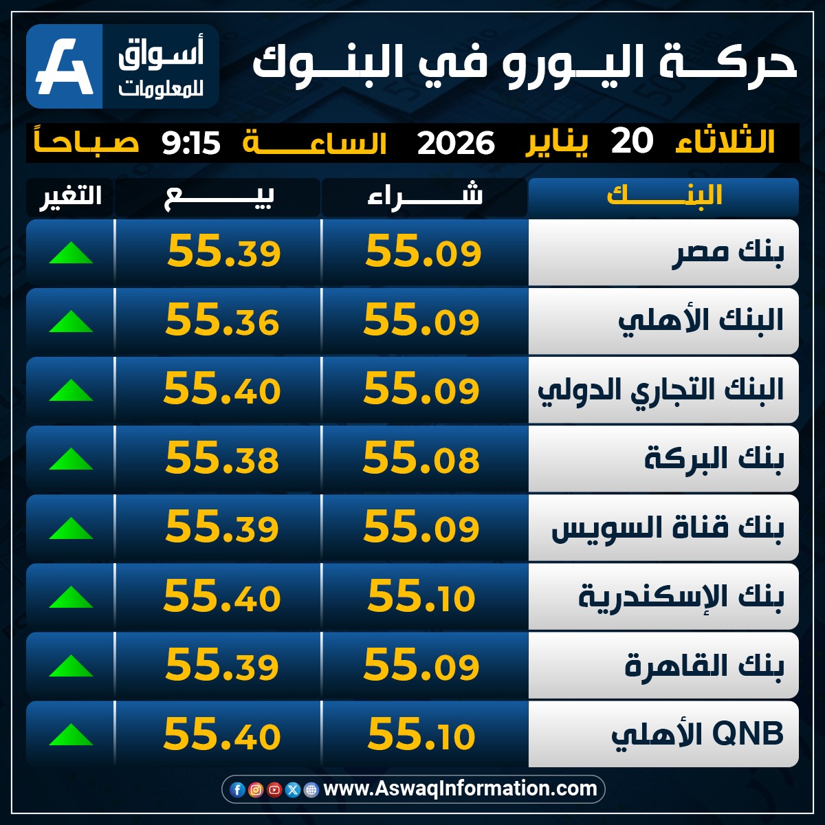 وصعد سعر اليورو في البنك الأهلي المصري نحو 55.09 جنيه للشراء، وسعر 55.36 جنيه للبيع