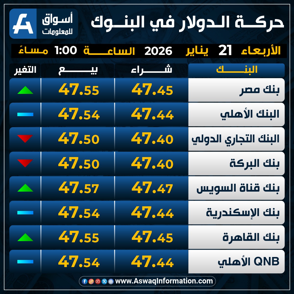 بينما ثبت سعر الدولار في البنك الأهلي المصري مقابل الجنيه المصري عند 47.44 جنيه للشراء، ونحو 47.54 جنيه للبيع.