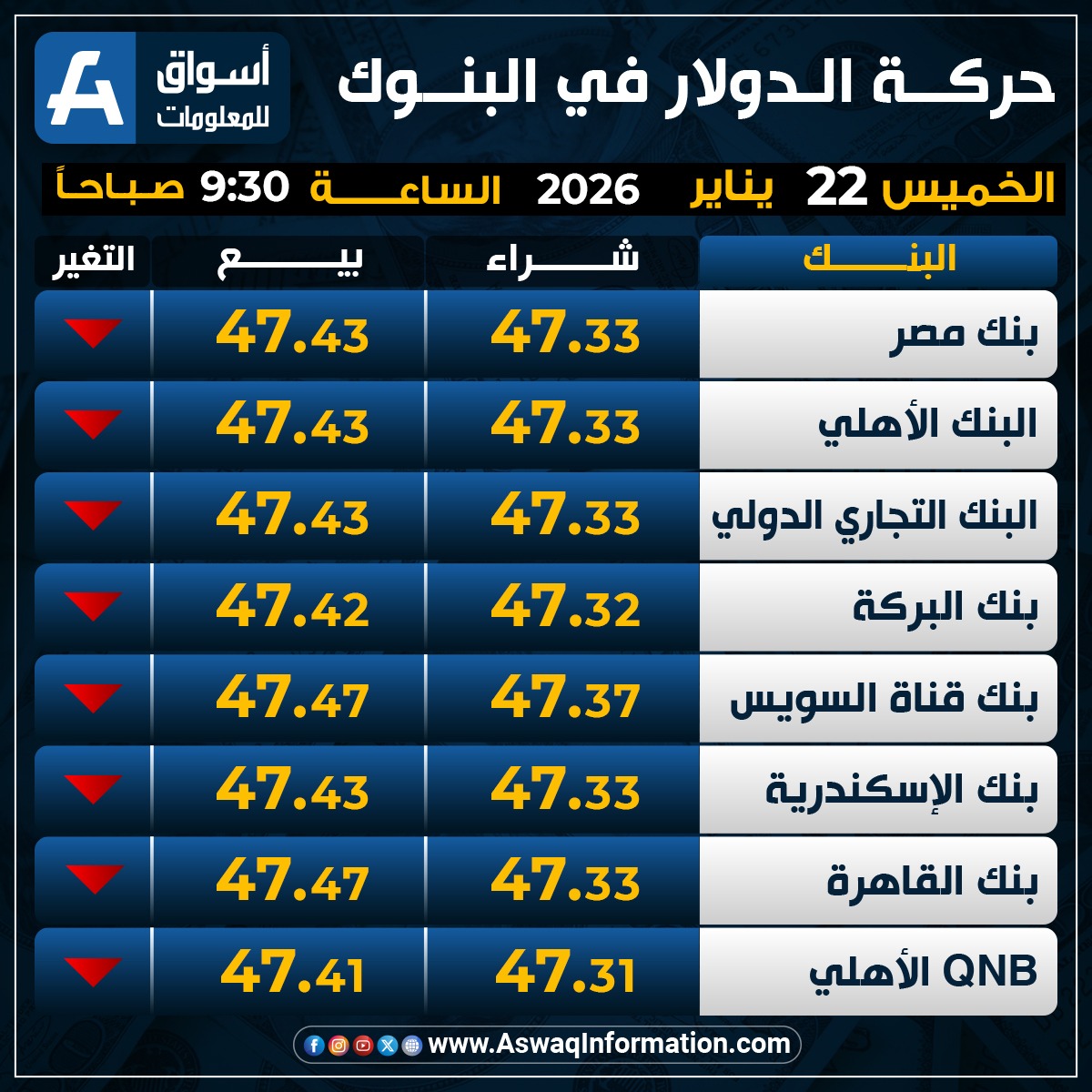 سعر الدولار اليوم.. ننشر لكم التفاصيل التي طرأت على العملة الخضراء التي شهدت تراجعًا بمستهل تعاملات اليوم الخميس 22 يناير 2026 مقابل الجنيه، وذلك بحسب شاشات التداول المعلنة بالبنوك الحكومية والخاصة العاملة داخل السوق المصرفية.
