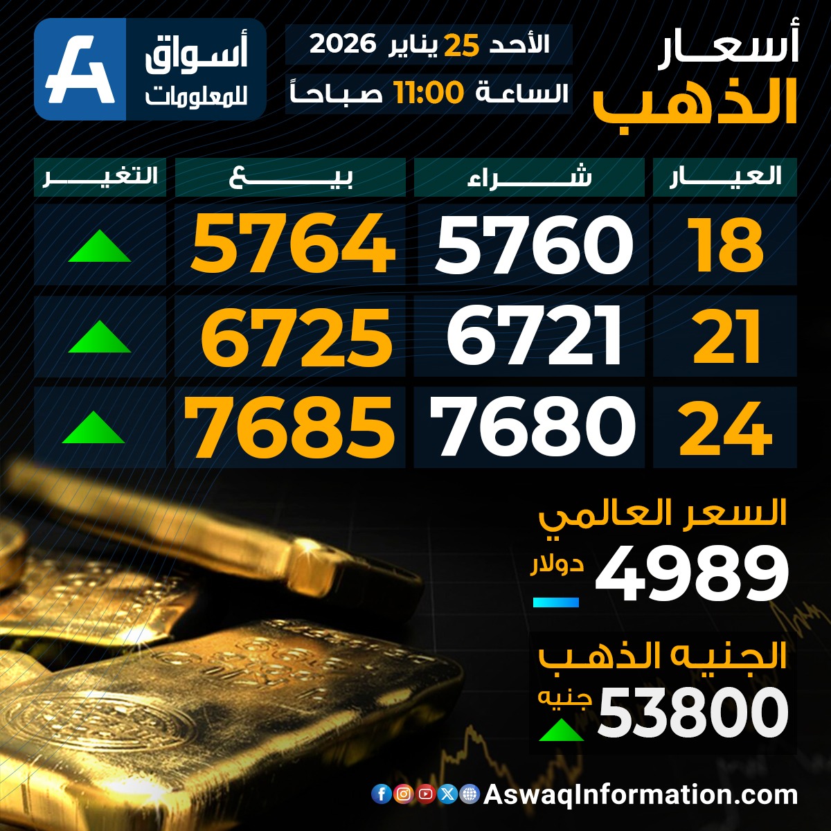 سجل سعر الجنيه الذهب اليوم الأحد 25 يناير 2026 ارتفاعًا عند 53.800 جنيهًا ، قبل إضافة المصنعية والضريبة والدمغة.