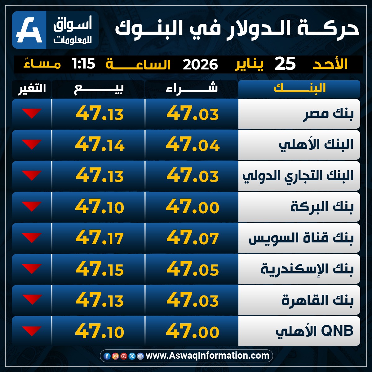 سعر الدولار اليوم.. ننشر لكم التفاصيل التي طرأت على العملة الخضراء التي شهدت تراجعًا بمنتصف تعاملات اليوم الأحد 25 يناير 2026 مقابل الجنيه، وذلك بحسب شاشات التداول المعلنة بالبنوك الحكومية والخاصة العاملة داخل السوق المصرفية.
