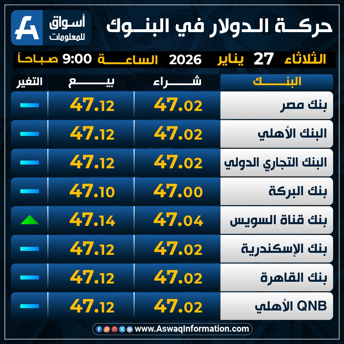 واستقر سعر الدولار في البنك الأهلي المصري مقابل الجنيه المصري عند 47.02 جنيه للشراء، ونحو 47.12 جنيه للبيع.