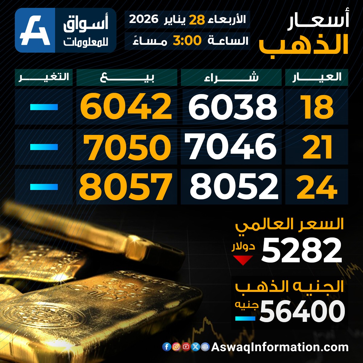 سجل سعر الجنيه الذهب اليوم الأربعاء 28 يناير 2026 استقرارًا عند 56.400 جنيهًا ، قبل إضافة المصنعية والضريبة والدمغة.