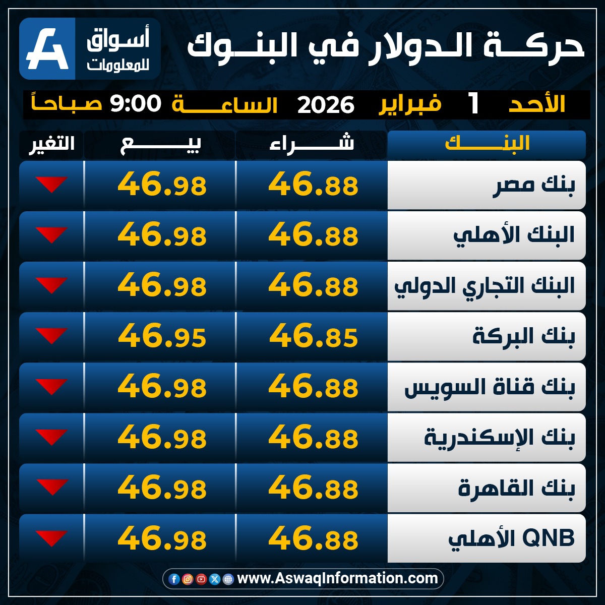 وانخفض سعر الدولار في البنك الأهلي المصري مقابل الجنيه المصري عند 46.88 جنيه للشراء، ونحو 46.98 جنيه للبيع.