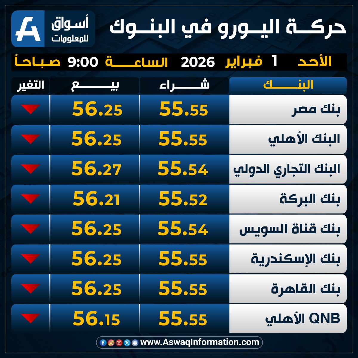 وانخفض سعر اليورو في البنك الأهلي المصري نحو 55.55 جنيه للشراء، وسعر 56.25 جنيه للبيع