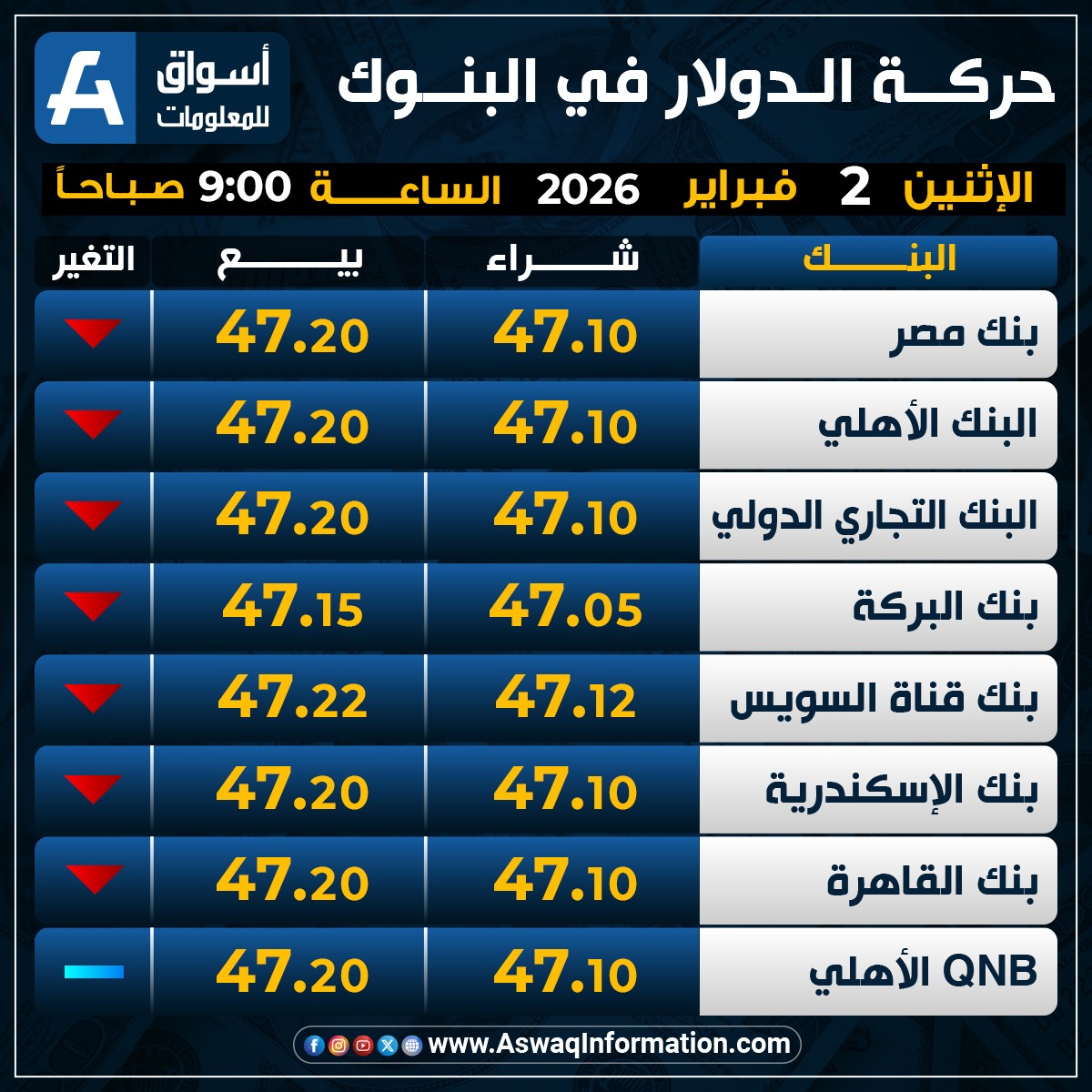 بينما استقر سعر الدولار في بنك QNB الأهلي مقابل الجنيه المصري عند 47.10 جنيه للشراء، ونحو 47.20 جنيه للبيع.