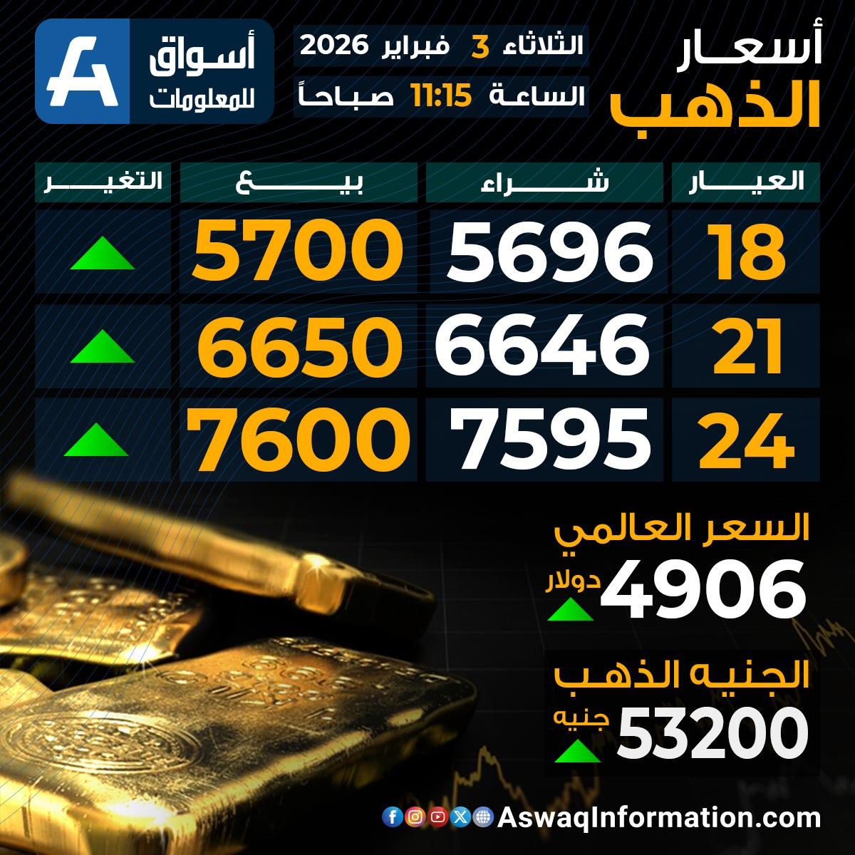 كما سجل سعر الذهب العالمي اليوم ارتفاعًا عند 4906 دولارا.
