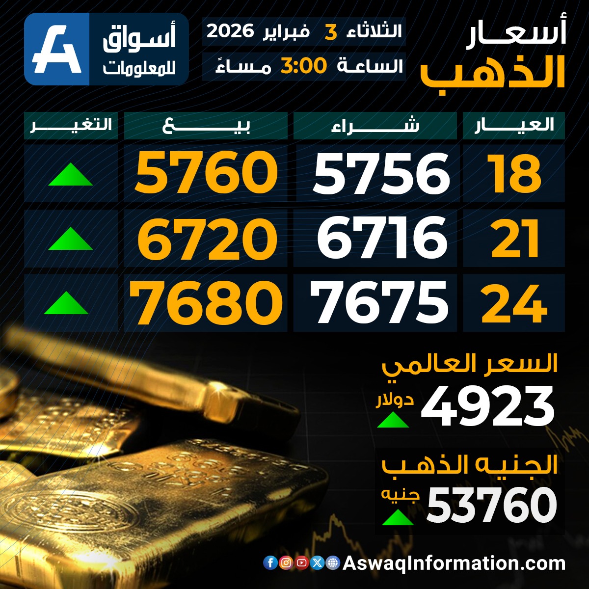 سجل سعر الجنيه الذهب اليوم الثلاثاء 3 فبراير 2026 ارتفاعًا عند 53.760 جنيهًا ، قبل إضافة المصنعية والضريبة والدمغة.