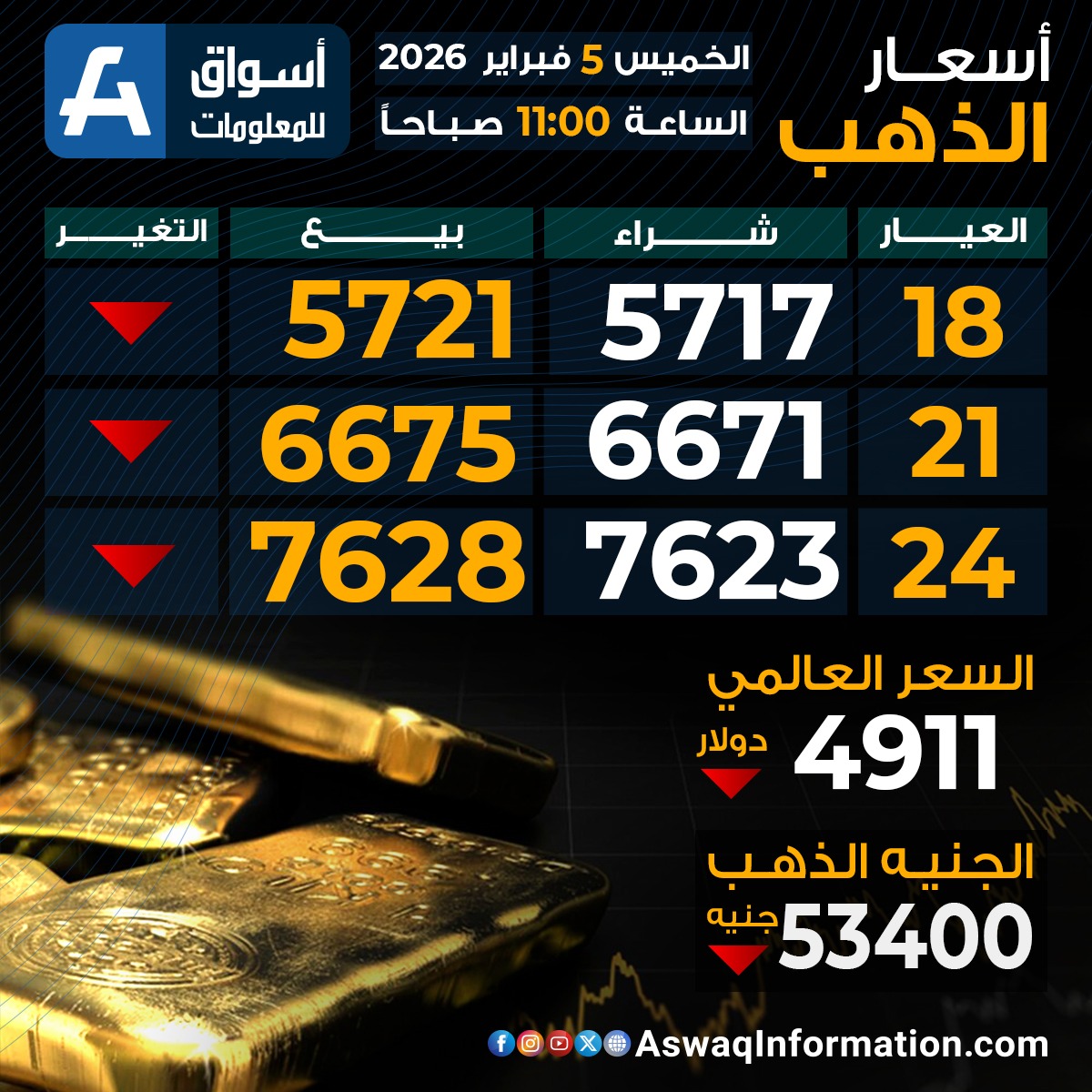 كما سجل سعر الذهب العالمي اليوم تراجعًا عند 4911 دولارا.