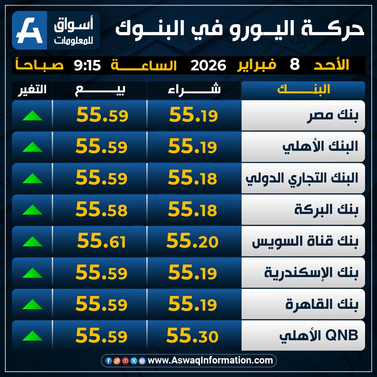 وقفز سعر اليورو في البنك الأهلي المصري نحو 55.19 جنيه للشراء، وسعر 55.59 جنيه للبيع