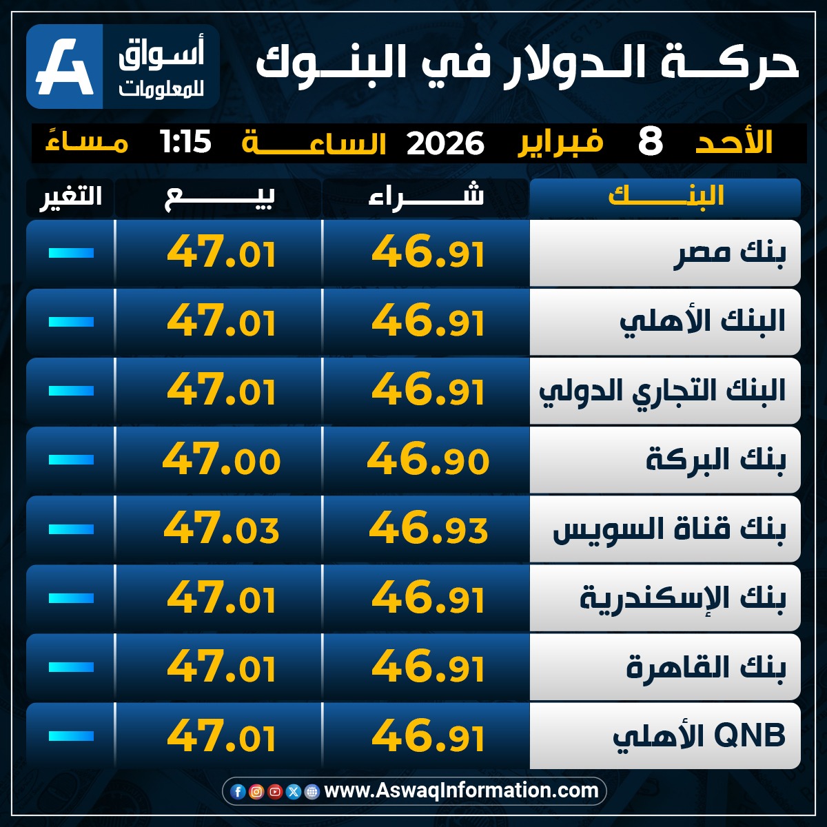 وثبت سعر الدولار في البنك الأهلي المصري مقابل الجنيه المصري عند 46.91 جنيه للشراء، ونحو 47.01 جنيه للبيع.