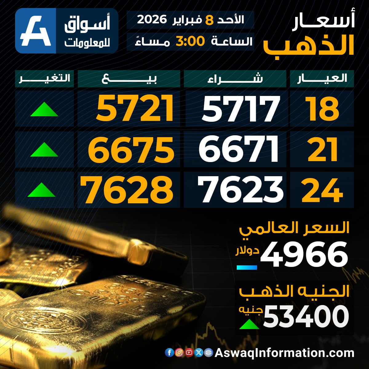 سجل سعر الجنيه الذهب اليوم الأحد 8 فبراير 2026 ارتفاعًا عند 53.400 جنيهًا ، قبل إضافة المصنعية والضريبة والدمغة.