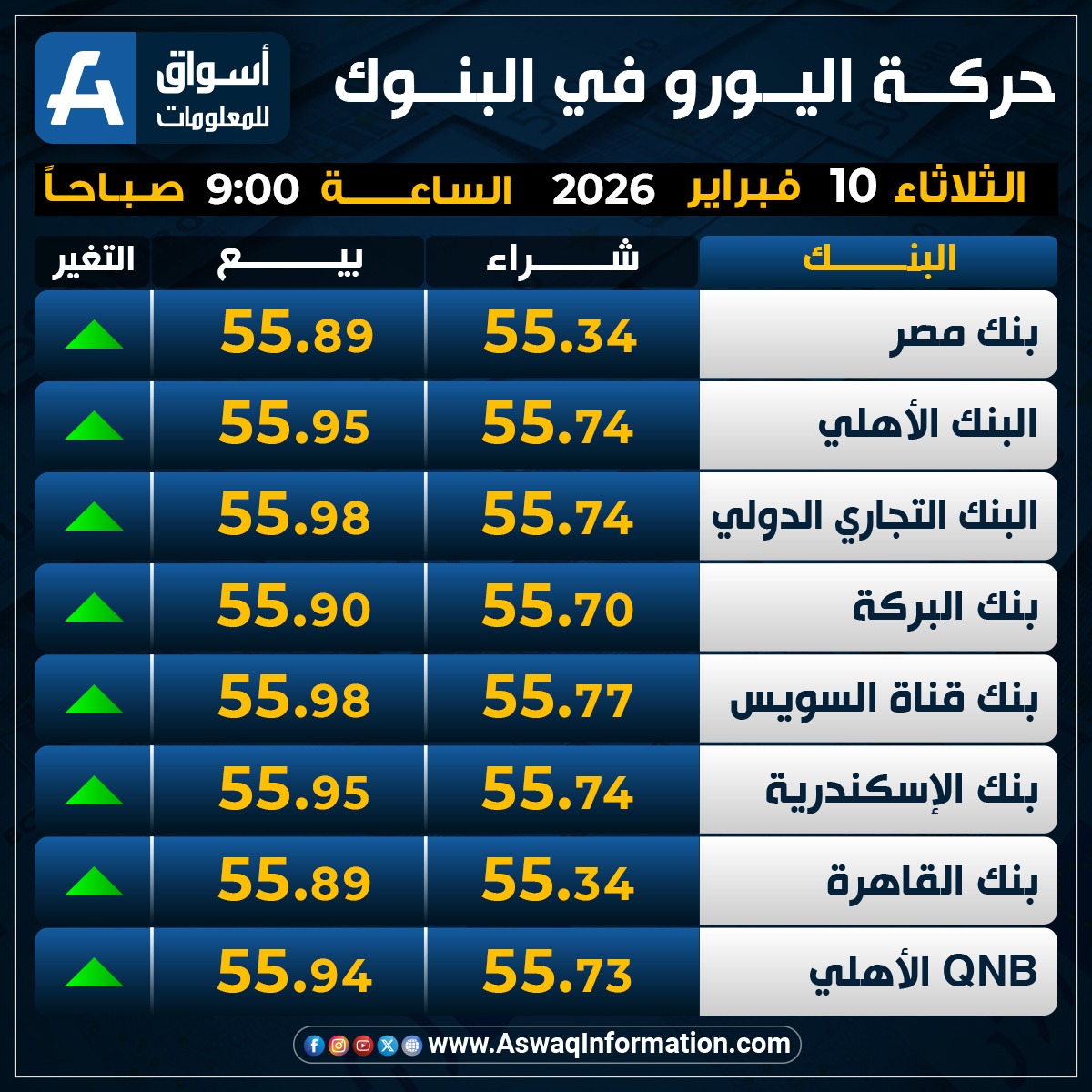 وقفز سعر اليورو في البنك الأهلي المصري نحو 55.74 جنيه للشراء، وسعر 55.95 جنيه للبيع