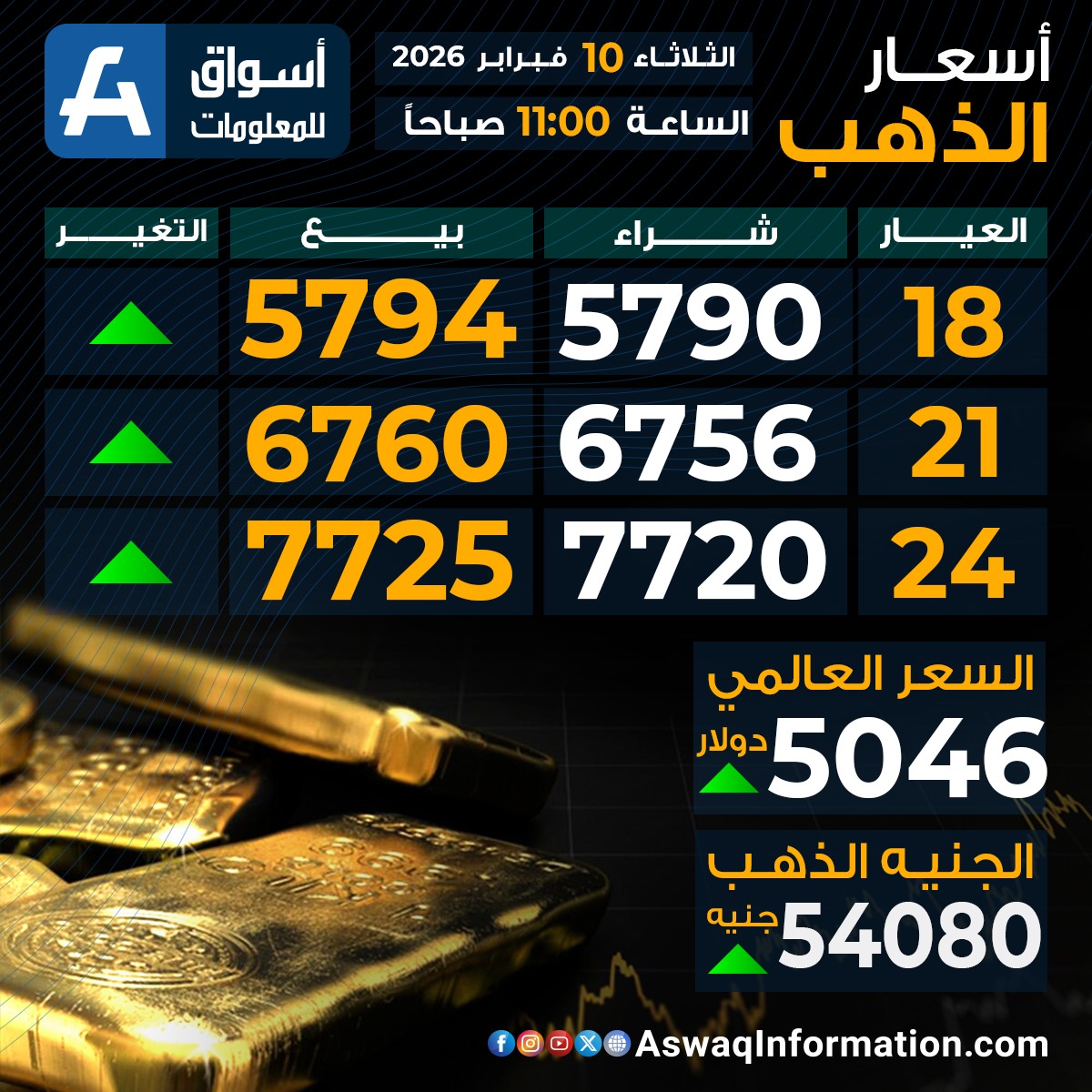 سجل سعر الجنيه الذهب اليوم الثلاثاء 10 فبراير 2026 ارتفاعًا عند 54.080 جنيهًا ، قبل إضافة المصنعية والضريبة والدمغة.