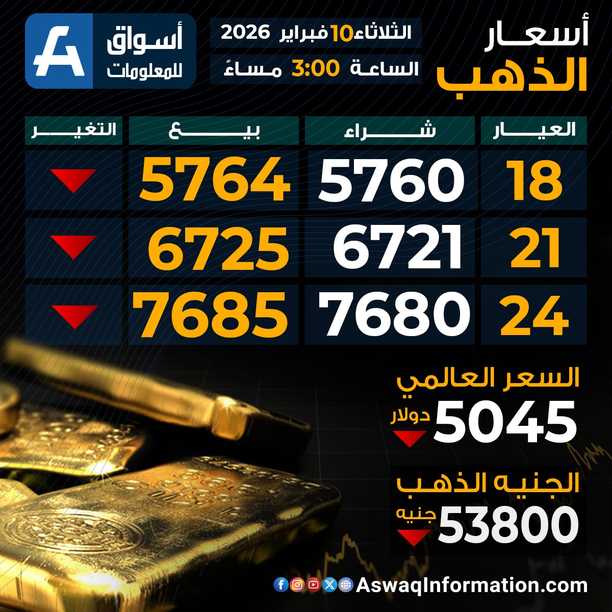 كما سجل سعر الذهب العالمي اليوم تراجعًا عند 5045 دولارا.