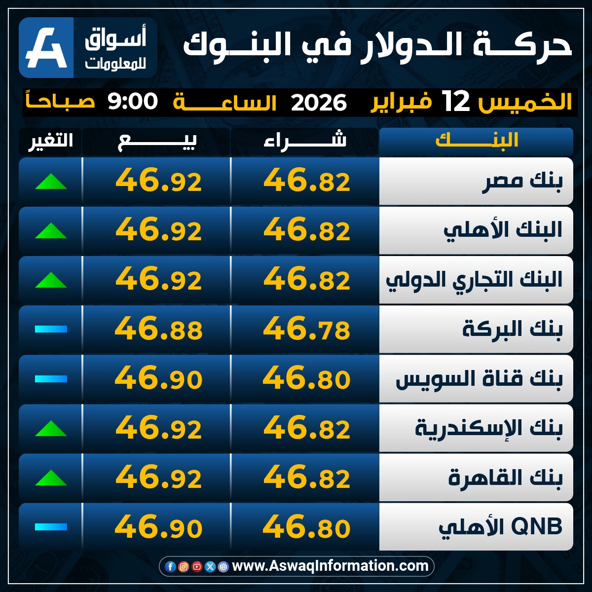 سعر الدولار اليوم.. ننشر لكم التفاصيل التي طرأت على العملة الخضراء التي شهدت تباينًا بمستهل تعاملات اليوم الخميس 12 فبراير 2026 مقابل الجنيه، وذلك بحسب شاشات التداول المعلنة بالبنوك الحكومية والخاصة العاملة داخل السوق المصرفية.