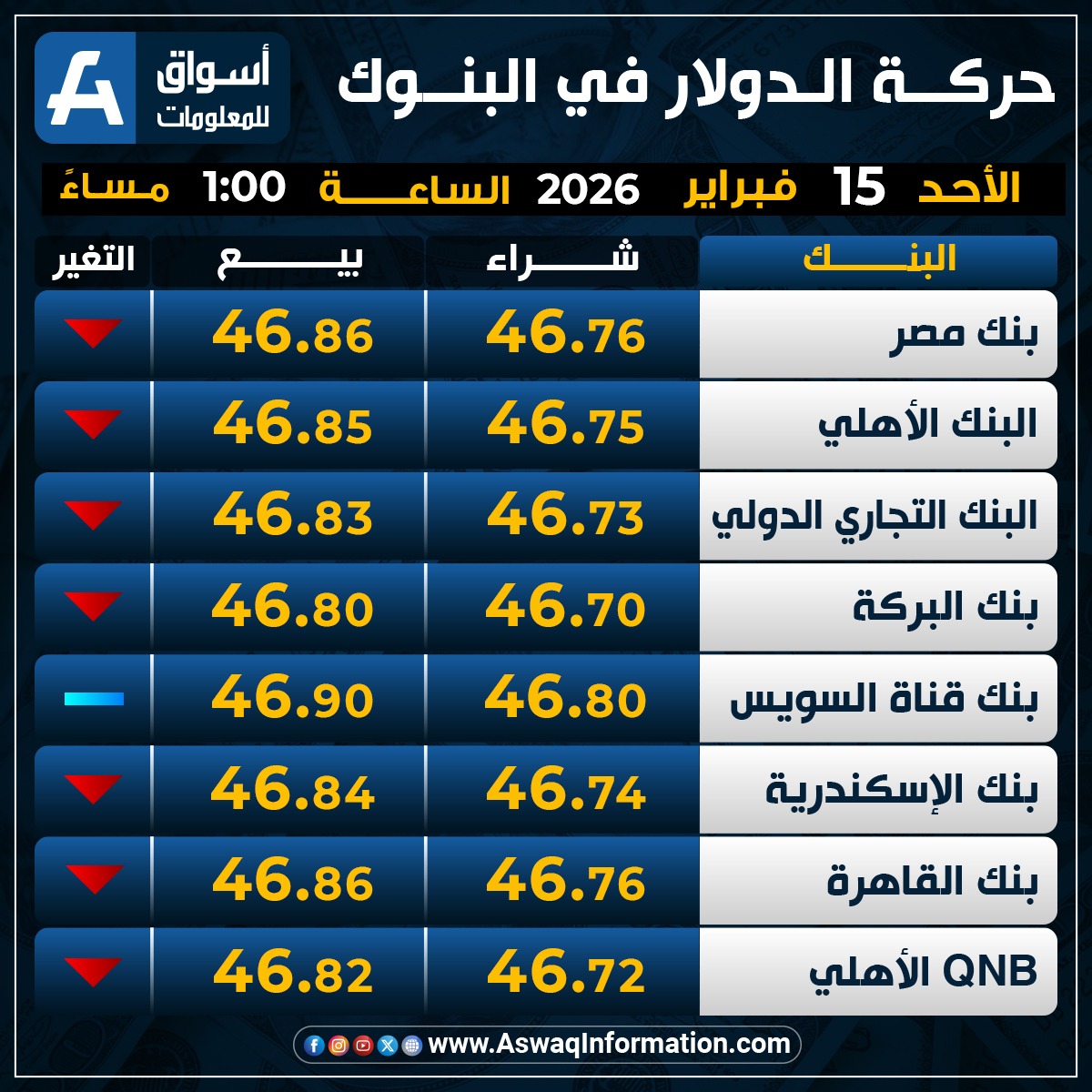 وانخفض سعر الدولار في بنك QNB الأهلي مقابل الجنيه المصري عند 46.72 جنيه للشراء، ونحو 46.82 جنيه للبيع.