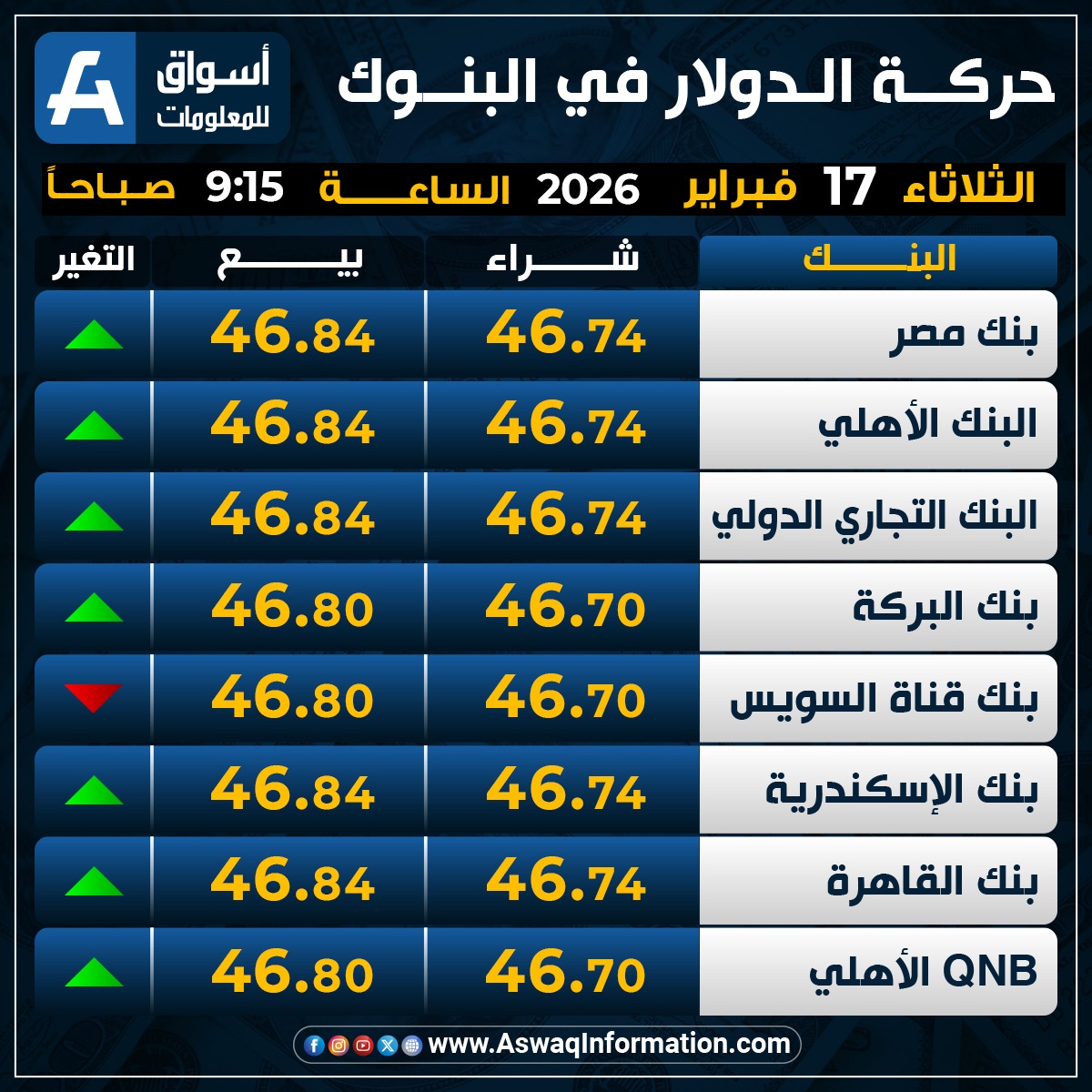 وصعد سعر الدولار في البنك الأهلي المصري مقابل الجنيه المصري عند 46.74 جنيه للشراء، ونحو 46.84 جنيه للبيع.