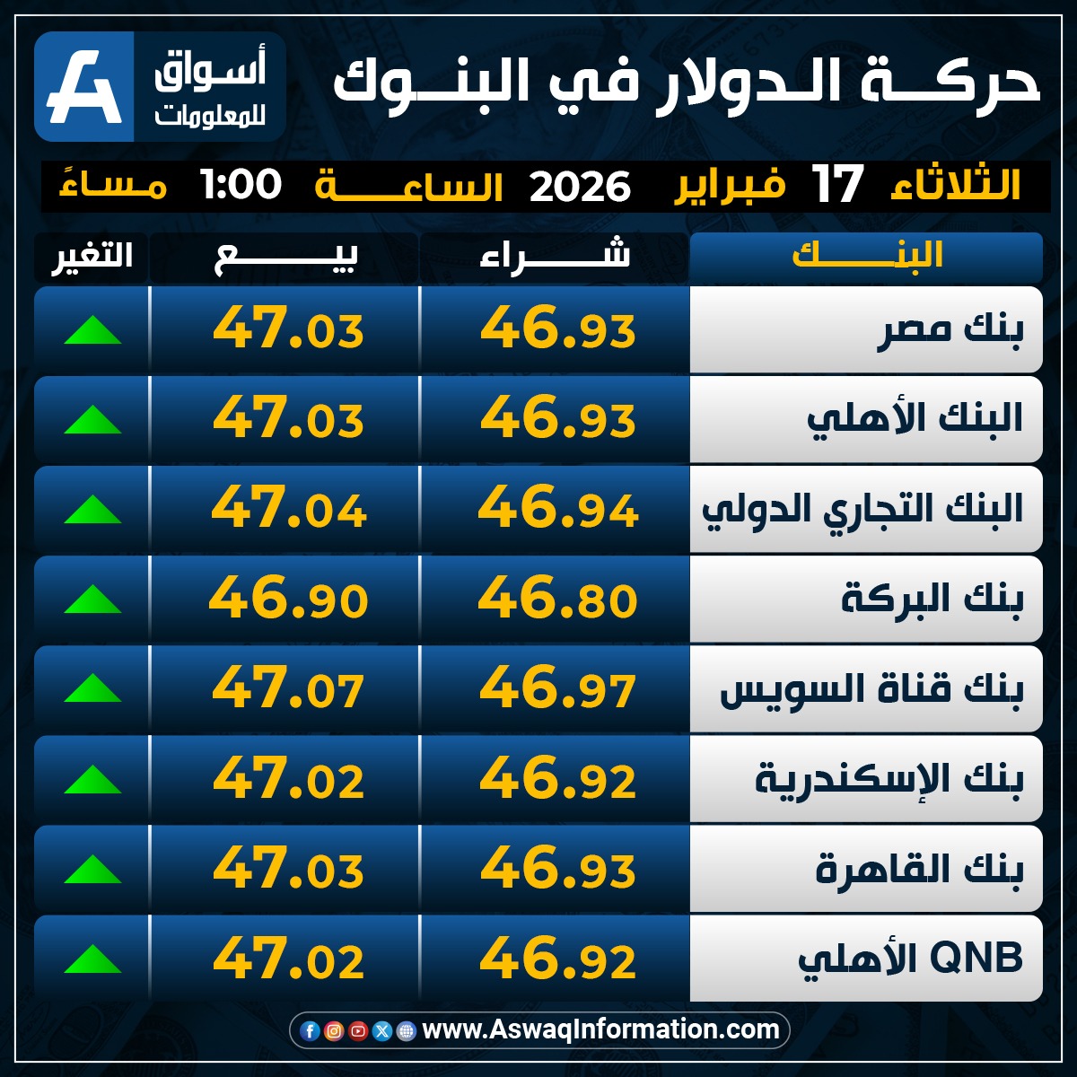 وصعد سعر الدولار في البنك الأهلي المصري مقابل الجنيه المصري عند 46.93 جنيه للشراء، ونحو 47.03 جنيه للبيع.