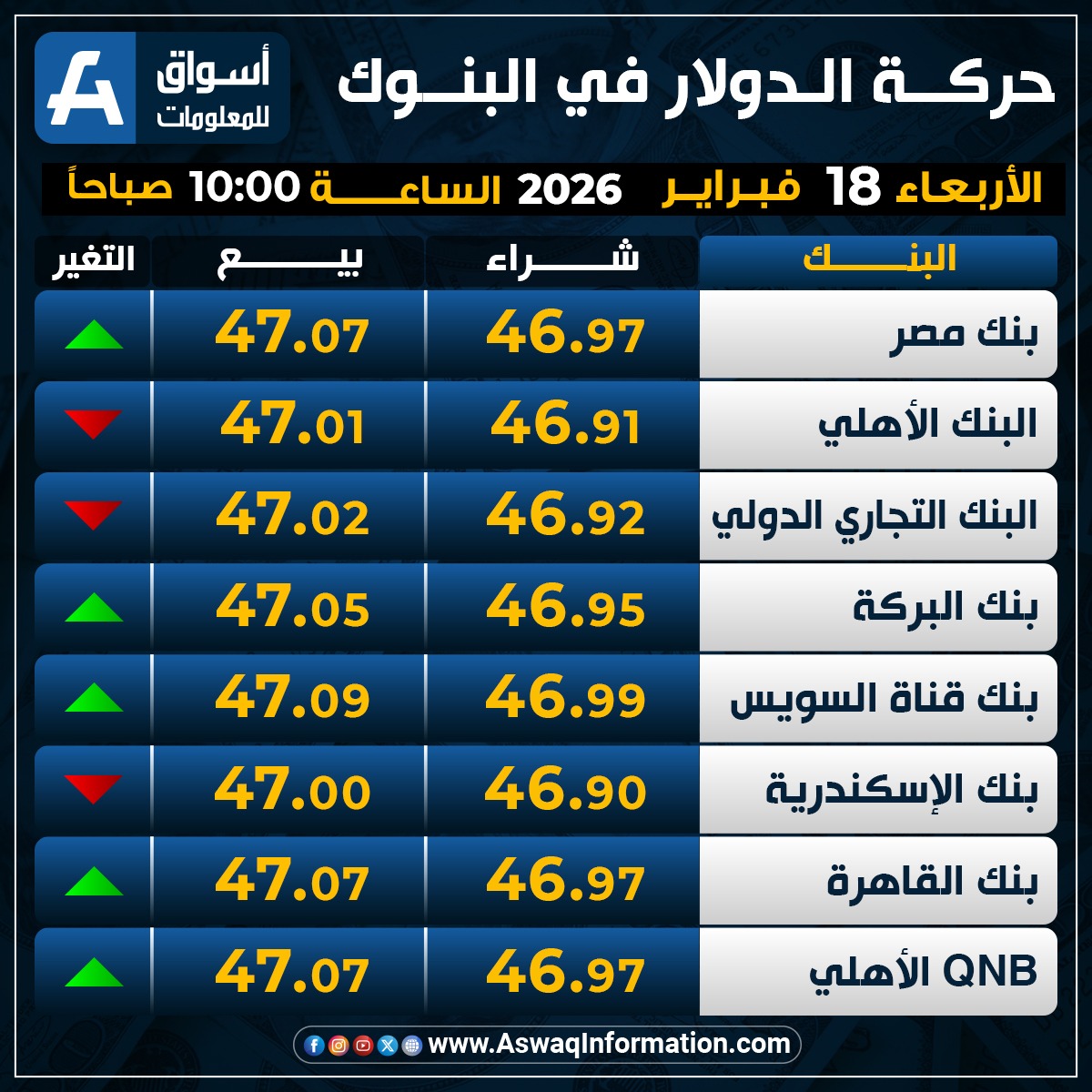 سعر الدولار اليوم.. ننشر لكم التفاصيل التي طرأت على العملة الخضراء التي شهدت تباينًا بمستهل تعاملات اليوم الأربعاء 18 فبراير 2026 مقابل الجنيه، وذلك بحسب شاشات التداول المعلنة بالبنوك الحكومية والخاصة العاملة داخل السوق المصرفية.